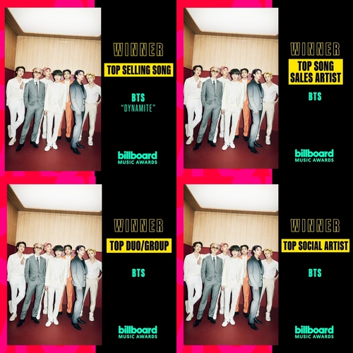 BTS was named on a prereleased list of winners in the three categories of Top Duo/Group, Top Song Sales Artist and the fan-voted Top Social Artist, while it was awarded Top Selling Song with its megahit "Dynamite" at the BBMA ceremony.