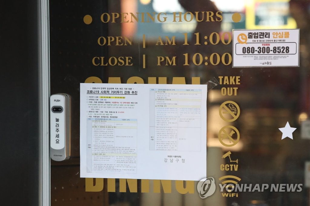 | ▲ A Seoul restaurant puts COVID-19 social distancing guidelines on its front door on Dec. 30, 2021. (Yonhap) |