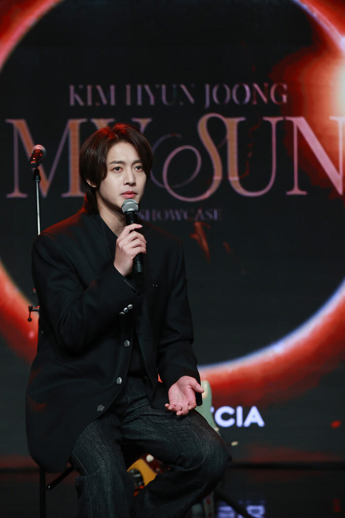 South Korean singer Kim Hyun-joong speaks during a showcase for his third album "My Sun" in Seoul on Feb. 27, 2023. (Yonhap)