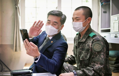| ▲ Defense Minister Suh Wook (L) makes a video call with family members of an Army draftee during his visit to a boot camp in Gyeonggi Province on May 11, 2021, in this photo provided by the defense ministry. (PHOTO NOT FOR SALE) (Yonhap) |