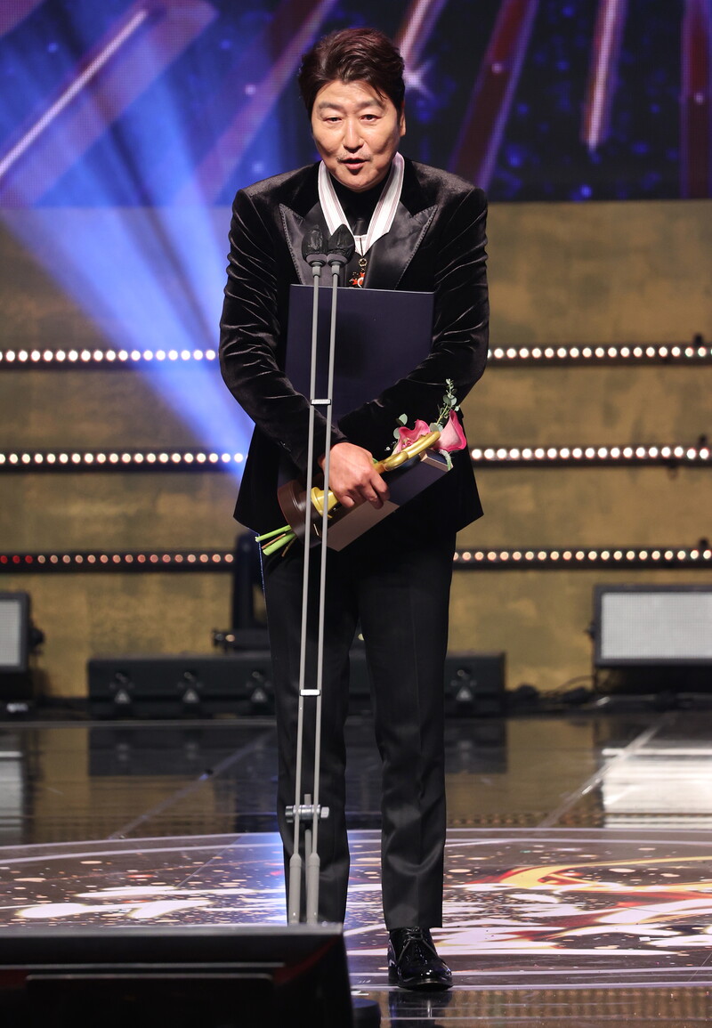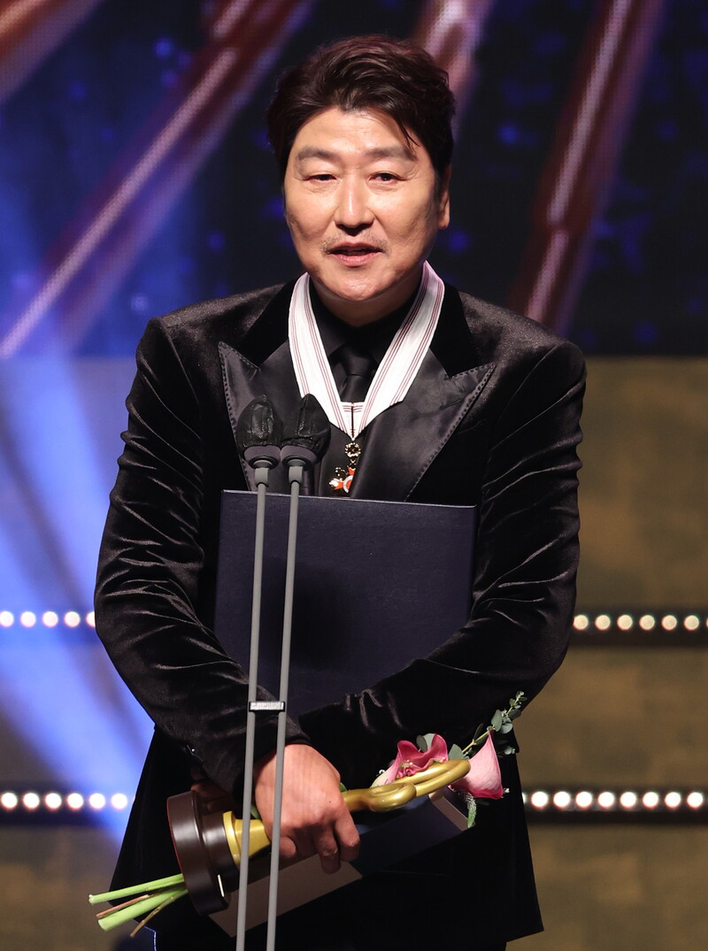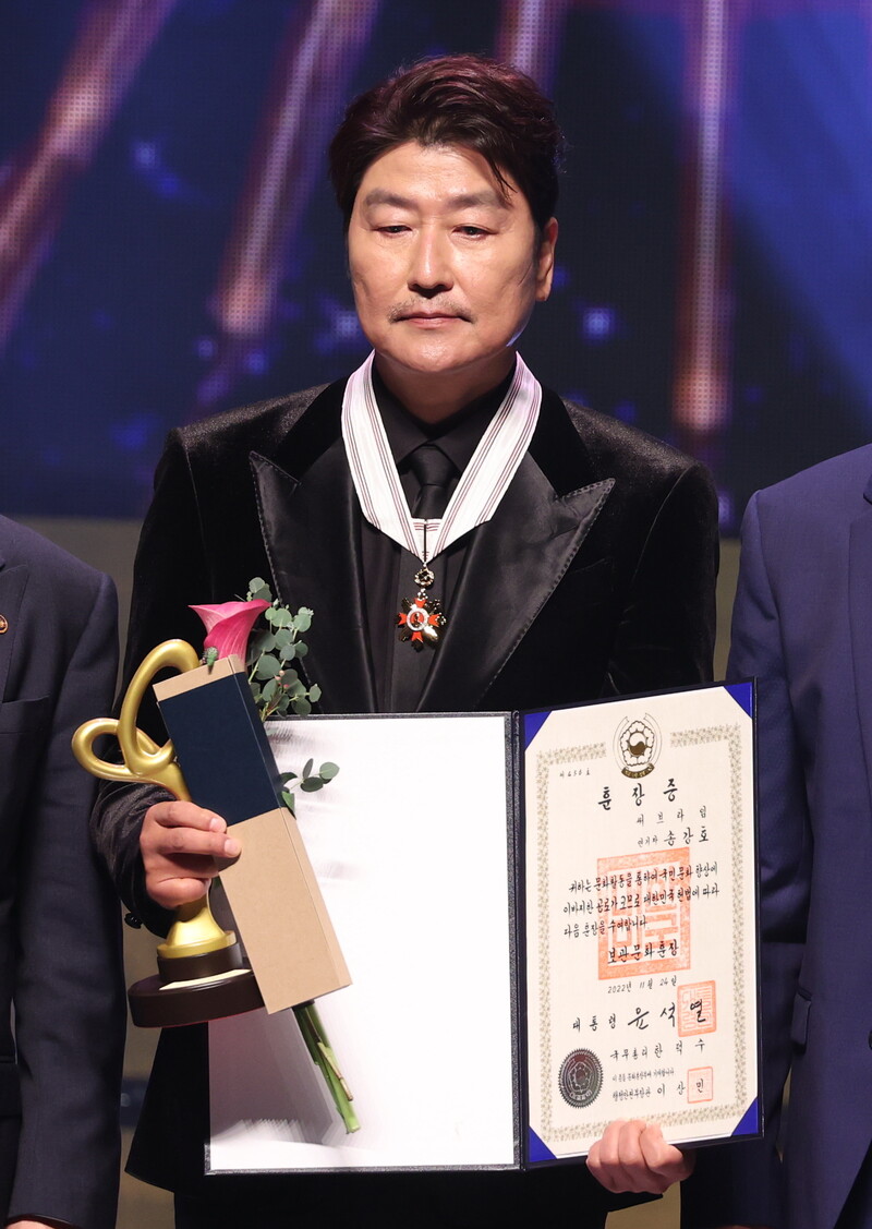 Actor Song Kang-ho speaks after receiving the Bogwan Order of Cultural Merit, the third-highest medal, at the Korean Popular Culture and Arts Awards ceremony at the National Theater of Korea in Seoul on Nov. 24, 2022. (Yonhap)