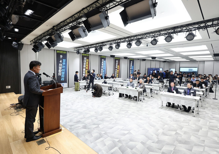 An emergency meeting of the Korean Medical Association's (KMA) representatives takes place at the KMA headquarters in Seoul on Feb. 7, 2024, to discuss measures against the government's plan to increase the number of medical students by 2,000 next year. (Yonhap)