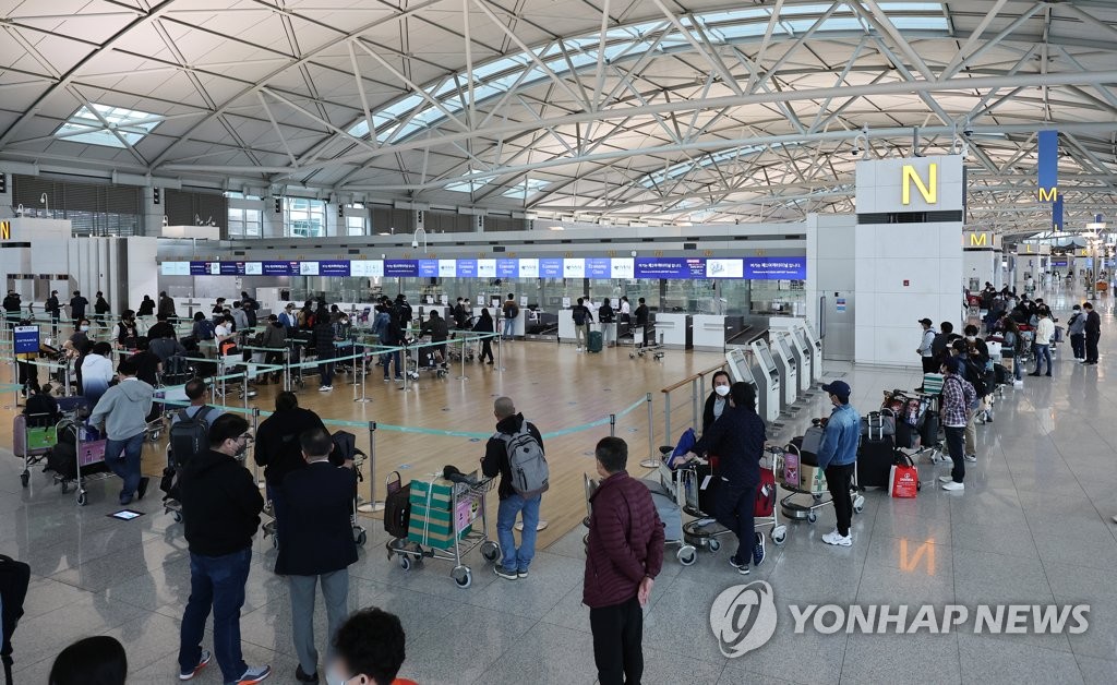 | ▲ Travelers wait in line to check in at Incheon International Airport, west of Seoul, on March 30, 2022. (Yonhap) |