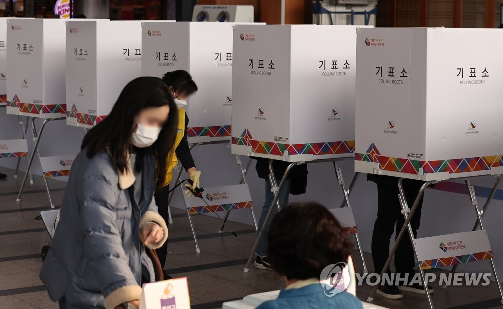 | ▲ This photo taken on March 4, 2022, shows a woman casting her ballot at a polling booth in Seoul, on the first day of the two-day early voting for next week's presidential election. (Yonhap) |