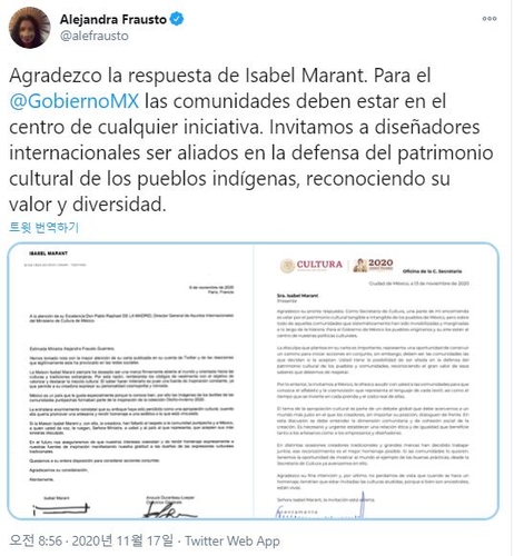 | ▲ 멕시코 문화부 장관이 공개한 이자벨 마랑의 답장 [트위터 갈무리. DB 및 재판매 금지] |
