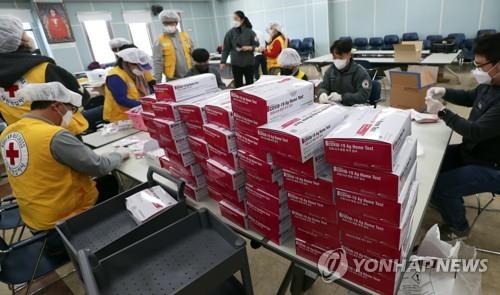 | ▲ Officials package COVID-19 self-test kits at a Red Cross office in the southwestern city of Jeonju on Feb. 23, 2022, to distribute them for free to kindergartens and elementary schools in their jurisdiction ahead of the start of the spring semester. (Yonhap) |