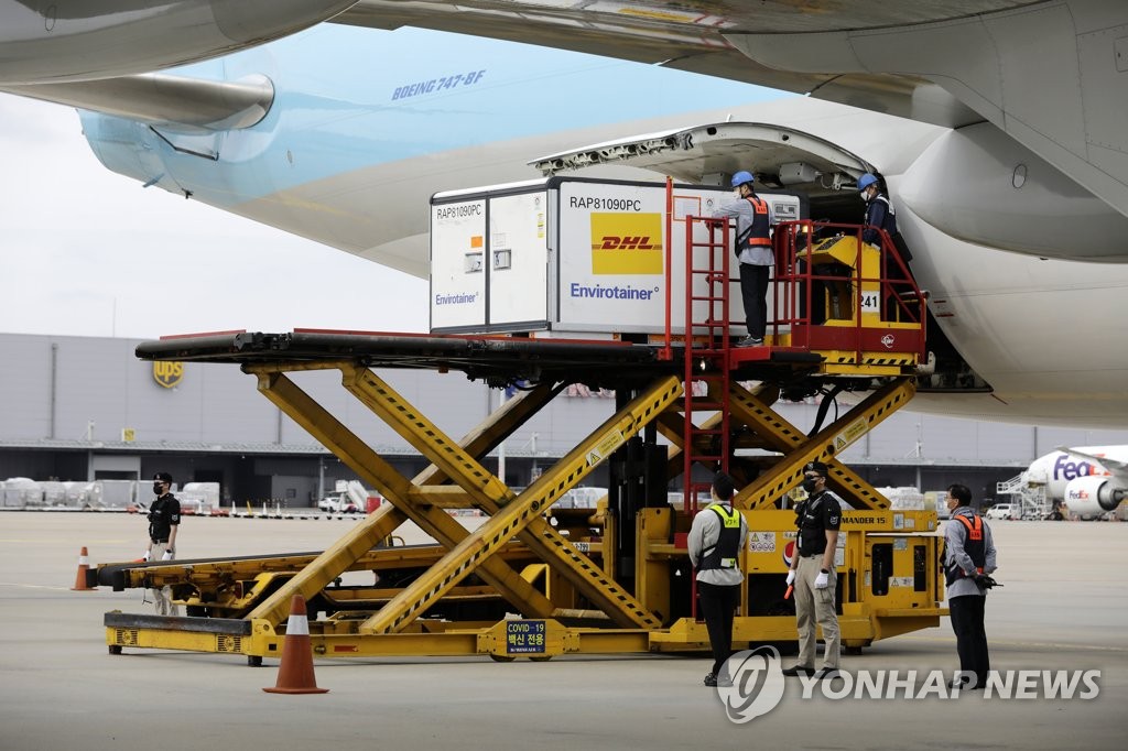 ▲ Airport workers offload Pfizer vaccines arriving from Britain at Incheon International Airport, west of Seoul, amid the extended COVID-19 pandemic on Oct. 7, 2021. (Yonhap)