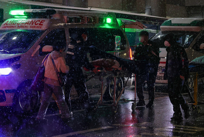 Rescue workers are busy moving a patient to the emergency room of a hospital in Seoul amid heavy snowfall on the night of Feb. 21, 2024, amid great confusion at hospitals nationwide due to thousands of trainee doctors' walkout in protest against the government's plan to significantly increase the number of medical students. (Yonhap)