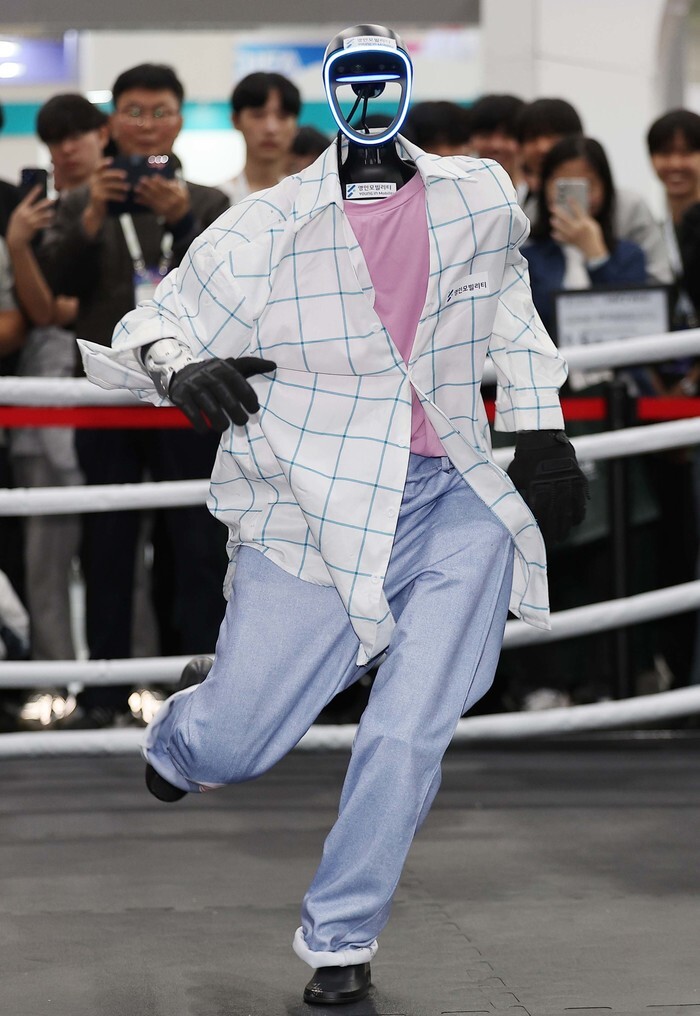 A humanoid robot, developed by China's Unitree Robotics, performs an idol dance during an international robot expo at the EXCO convention center in the southeastern city of Daegu on Oct. 22, 2025. (Yonhap)