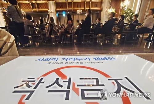 | ▲ This photo, taken on Oct. 3, 2021, shows a sign calling for keeping a safe distance amid the pandemic, which was put up at a wedding hall in Seoul. (Yonhap) |
