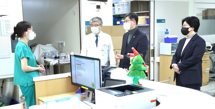 First Vice Health Minister Lee Ki-il (2nd from R) visits Asan Medical Center in eastern Seoul on Feb. 25, 2024, to boost the morale of medical workers treating patients amid thousands of trainee doctors' work stoppage in protest of the government's plan to raise medical students, in this photo provided by the Ministry of Health and Welfare. (PHOTO NOT FOR SALE) (Yonhap)