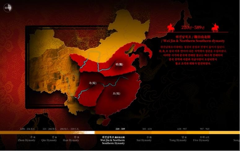 16일 국회 문체위원회 소속 국민의힘 배현진 의원실이 공개한 영상 자료에는 삼국지 위나라가 3세기 백제와 마한이 있었던 지금의 수도권과 충청남도 일대까지 다스린 것으로 표시됐다. 한나라의 영토는 한강 이북 지역까지 포함했던 것으로도 나온다.
