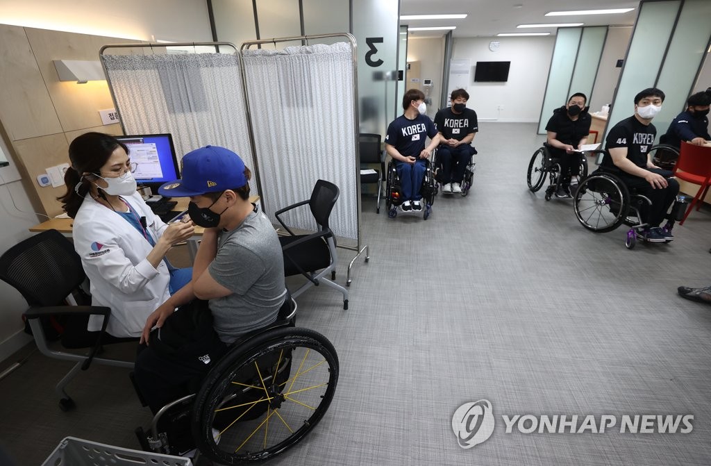 | ▲ An athlete, who will compete in the Tokyo Paralympics, receives a COVID-19 vaccine shot at the National Medical Center in central Seoul on April 30, 2021. (Yonhap) |