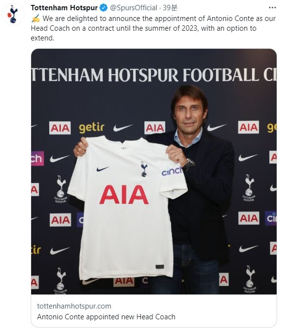 | ▲ 토트넘, 콘테 감독 선임 [토트넘 트위터 캡처. 재판매 및 DB 금지] |