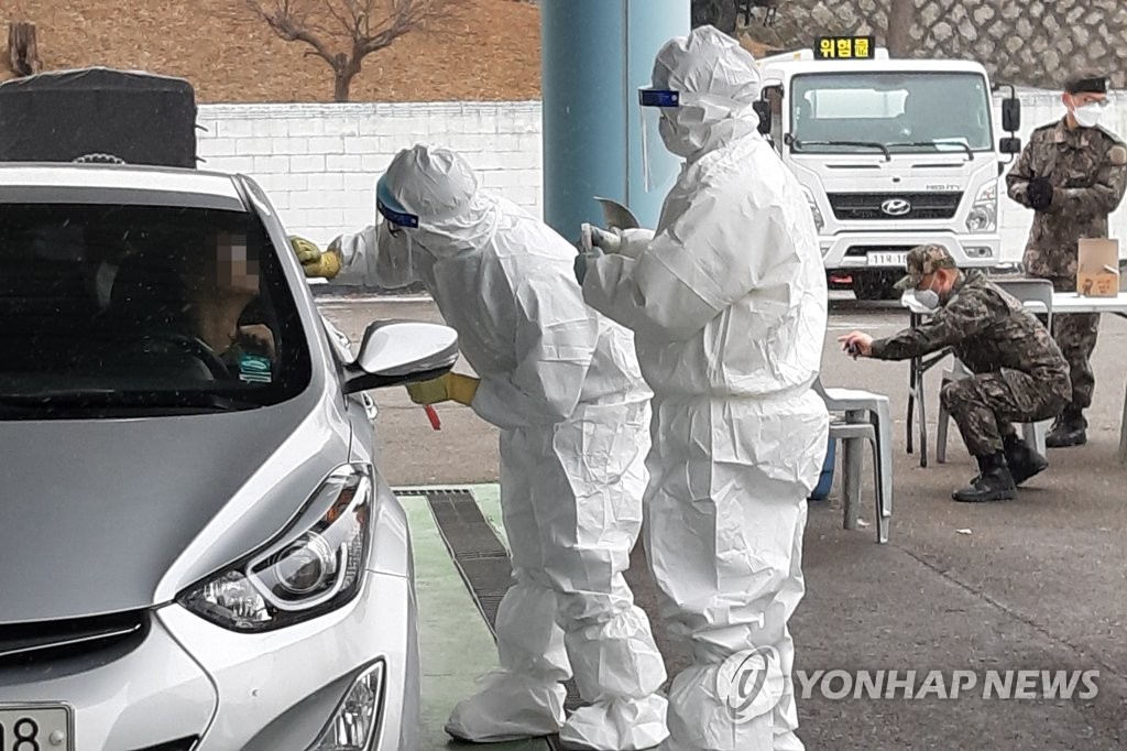 ▲ Medical staff conduct drive-thru COVID-19 testing at the Joint Chief of Staff in central Seoul on Feb. 16, 2021. (Yonhap)