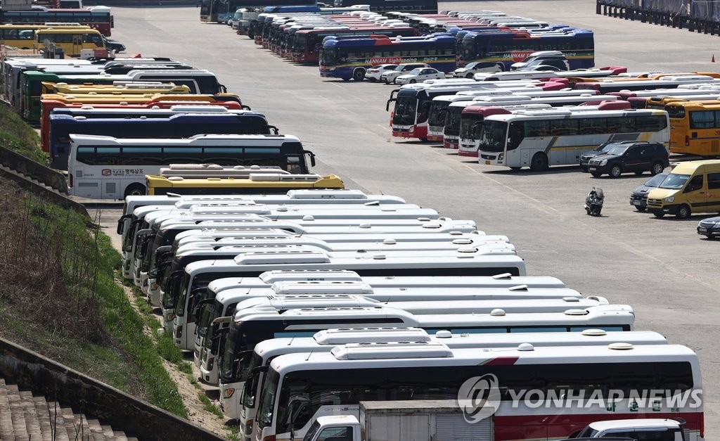 ▲ Buses are parked in a parking lot in eastern Seoul on April 6, 2021, due to the falling number of passengers amid the new coronavirus pandemic. (Yonhap)