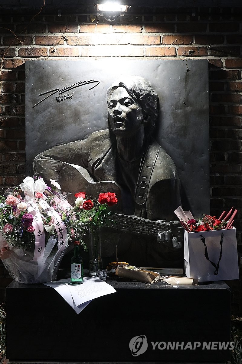 | ▲ 김광석 29주기, 제3회 김광석 노래상 경연대회 열려 (서울=연합뉴스) 류효림 기자 = 6일 오후 서울 대학로 아르코꿈밭극장(전 학전블루 소극장) 김광석 노래비에 방문객들이 추모 꽃다발이 놓여있다. 2025.1.6 ryousanta@yna.co.kr |