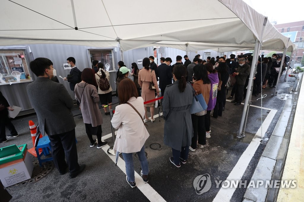 ▲ Employees at the Ministry of Justice wait for COVID-19 tests at a clinic on April 16, 2021, after the ministry reported a confirmed case at the building in Gwacheon, south of Seoul. (Yonhap)