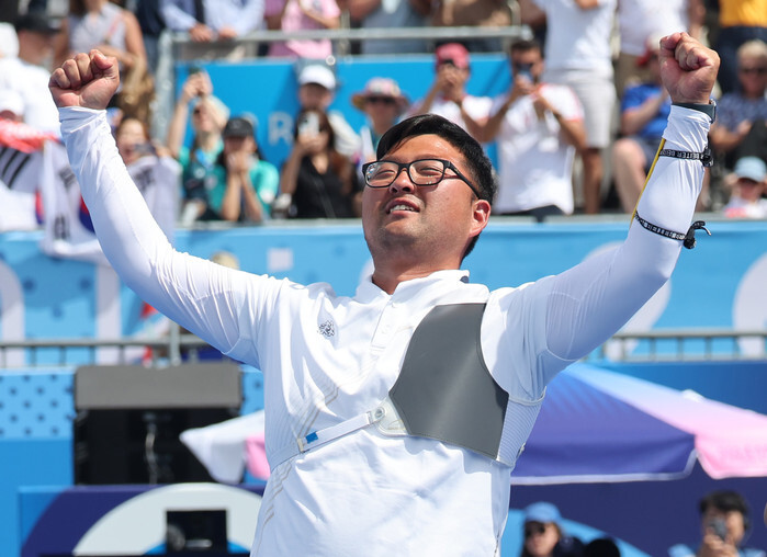 Kim Woo-jin of South Korea celebrates after winning the gold medal in the men's individual archery event at the Paris Olympics at Invalides in Paris on Aug. 4, 2024. (Yonhap)