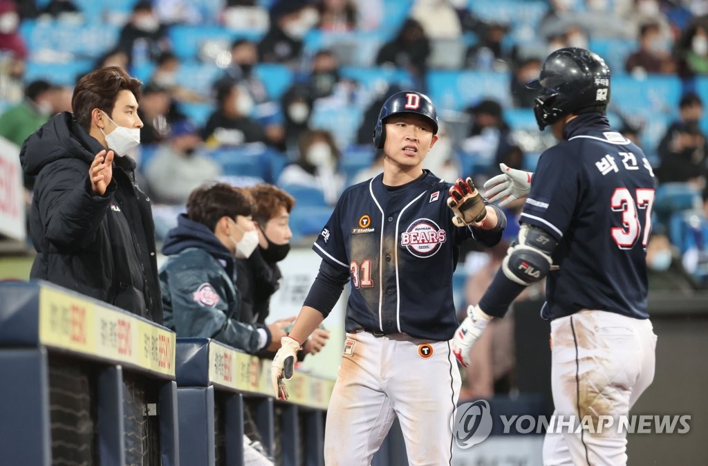 | ▲ Jung Soo-bin of the Doosan Bears (C) is congratulated by teammate Park Kun-woo (R) after scoring a run against the Samsung Lions in the top of the eighth inning during Game 1 of the second round in the Korea Baseball Organization postseason at Daegu Samsung Lions Park in Daegu, some 300 kilometers southeast of Seoul, on Nov. 9, 2021. (Yonhap) |