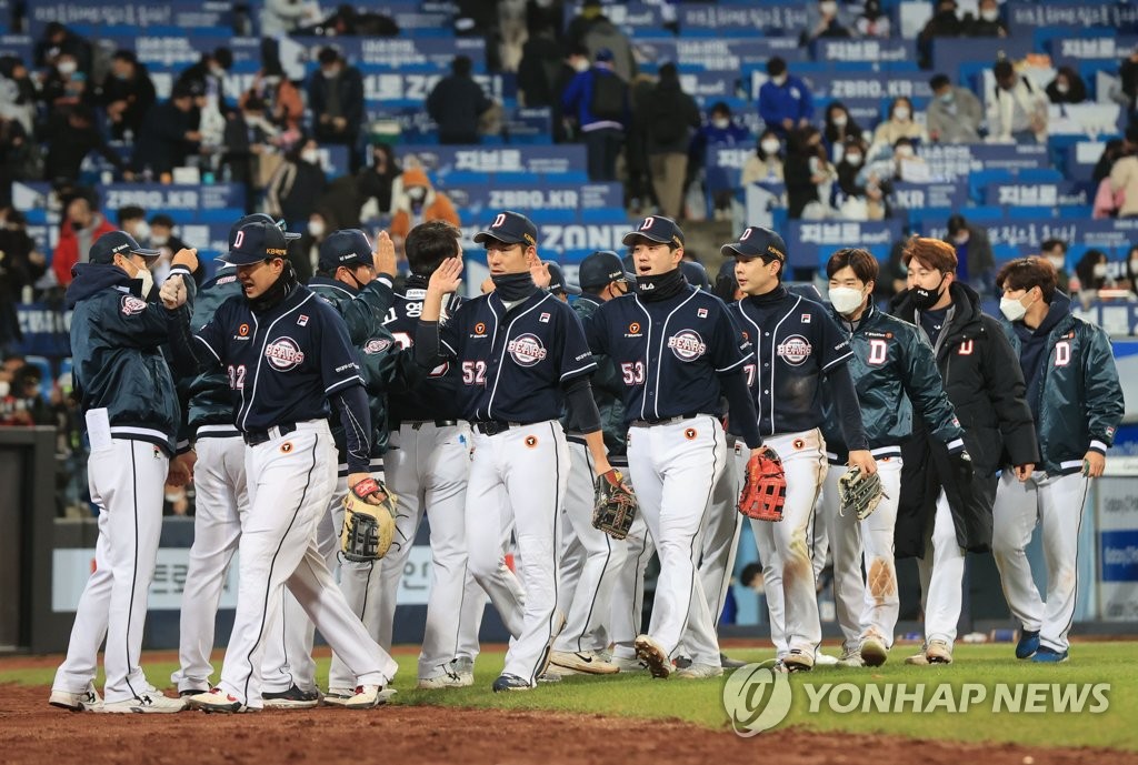 | ▲ Members of the Doosan Bears celebrate their 6-4 victory over the Samsung Lions in Game 1 of the second round in the Korea Baseball Organization postseason at Daegu Samsung Lions Park in Daegu, some 300 kilometers southeast of Seoul, on Nov. 9, 2021. (Yonhap) |