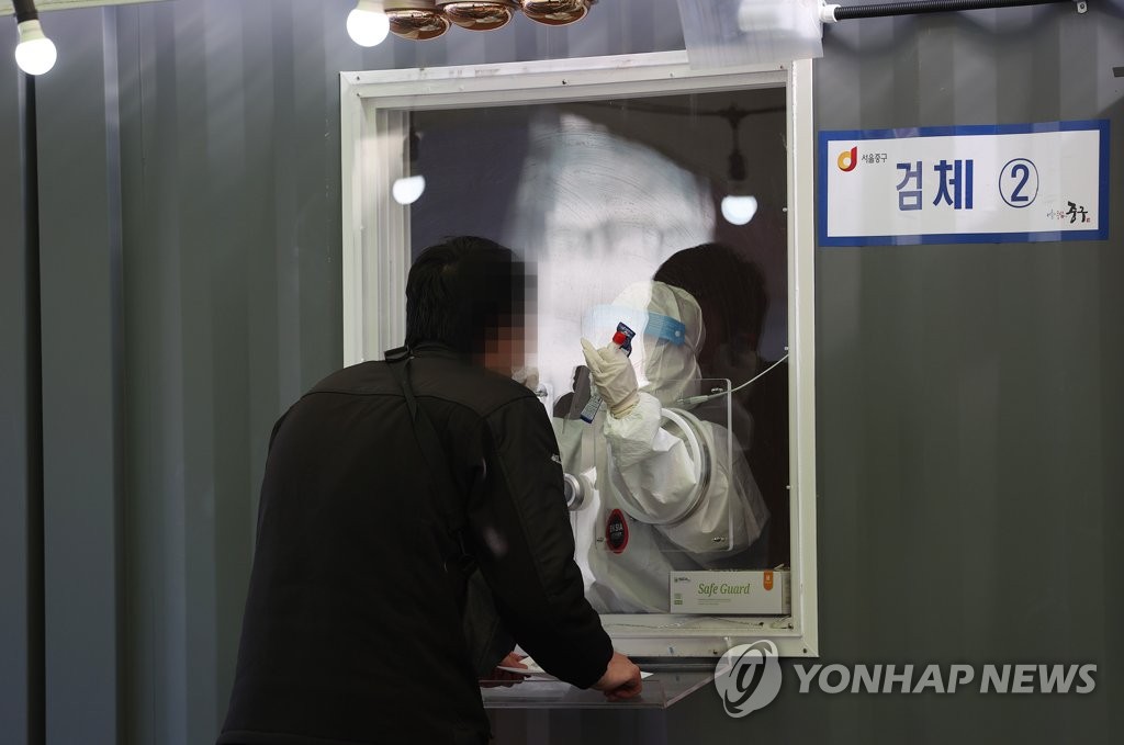 ▲ A medical worker collects a specimen for coronavirus testing at a temporary clinic in front of Seoul Station on Jan. 24, 2021, as the third wave of the COVID-19 pandemic, which started in November last year, shows signs of a let-up after peaking with daily cases of 1,241 on Dec. 25. (Yonhap)
