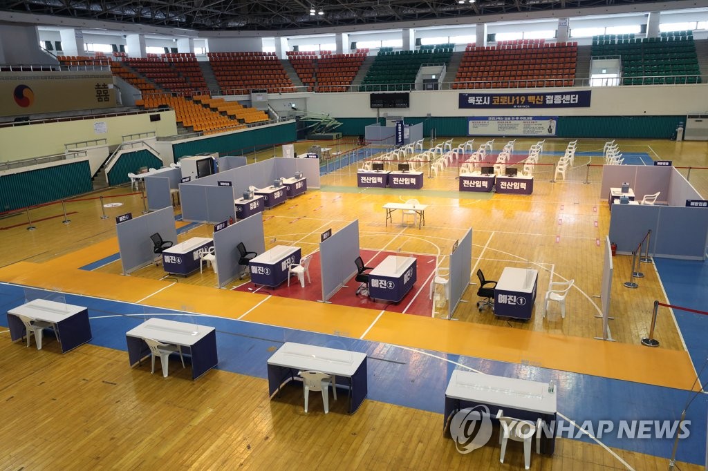 ▲ This photo, taken on Feb. 18, 2021, shows a COVID-19 vaccination center set up in an indoor stadium in Mokpo, 410 kilometers south of Seoul. (Yonhap)