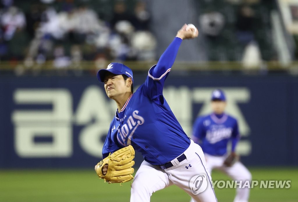 ▲ Samsung Lions' starter Baek Jung-hyun pitches against the Doosan Bears in the bottom of the first inning during Game 2 of the second round in the Korea Baseball Organization postseason at Jamsil Baseball Stadium in Seoul on Nov. 10, 2021. (Yonhap)