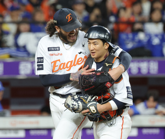 Hanwha Eagles starter Cody Ponce (L) shares a hug with his catcher Choi Jae-hoon after finishing the top of the third inning of Game 5 of the second-round series in the Korea Baseball Organization postseason against the Samsung Lions at Daejeon Hanwha Life Ballpark in the central city of Daejeon on Oct. 24, 2025. (Yonhap)