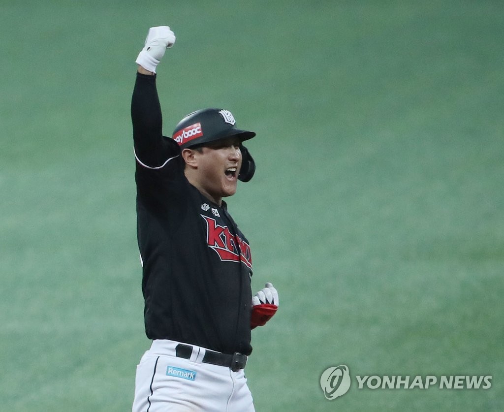 ▲ Hwang Jae-gyun of the KT Wiz celebrates his RBI double against the Doosan Bears in the top of the second inning during Game 4 of the Korean Series at Gocheok Sky Dome in Seoul on Nov. 18, 2021. (Yonhap)