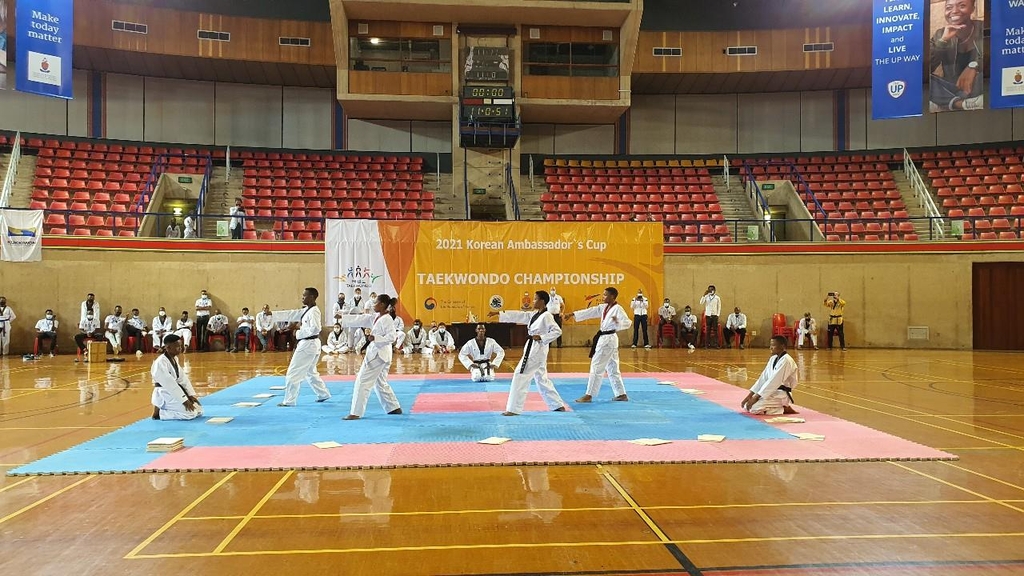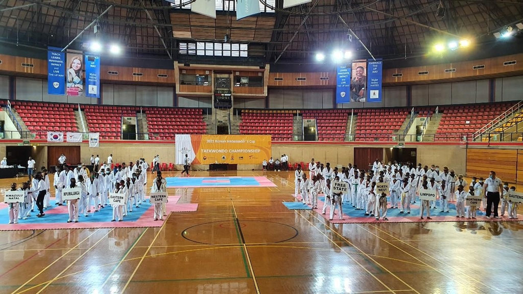 (프리토리아=연합뉴스) 김성진 특파원 = 남아프리카공화국에서 지난해 신종 코로나바이러스 감염증(코로나19)로 열리지 못했던 한국대사배 태권도대회가 23일(현지시간) 프리토리아 대학 체육관에서 열렸다.