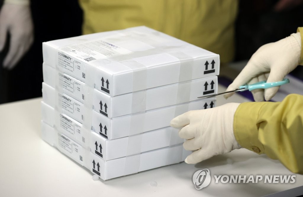 ▲ A medical official opens boxes containing the Pfizer COVID-19 vaccine at an inoculation center in Seongdong, eastern Seoul. (Yonhap)