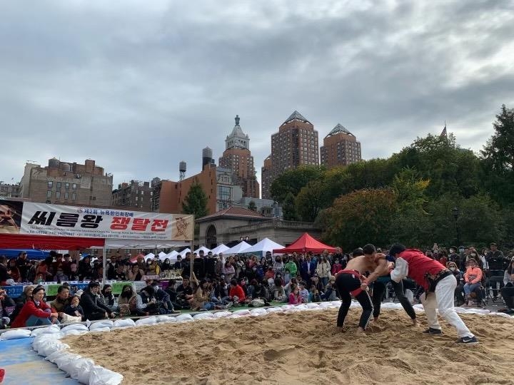 | ▲ 씨름대회 참가한 뉴요커들 (뉴욕=연합뉴스) 24일(현지시간) 미국 뉴욕 유니언스퀘어에서 열린 '2021 코리안 페스티벌'에서 씨름대회 참가한 뉴욕 주민들. 2021.10.25 [뉴욕한인회 제공. 재판매 및 DB 금지] |