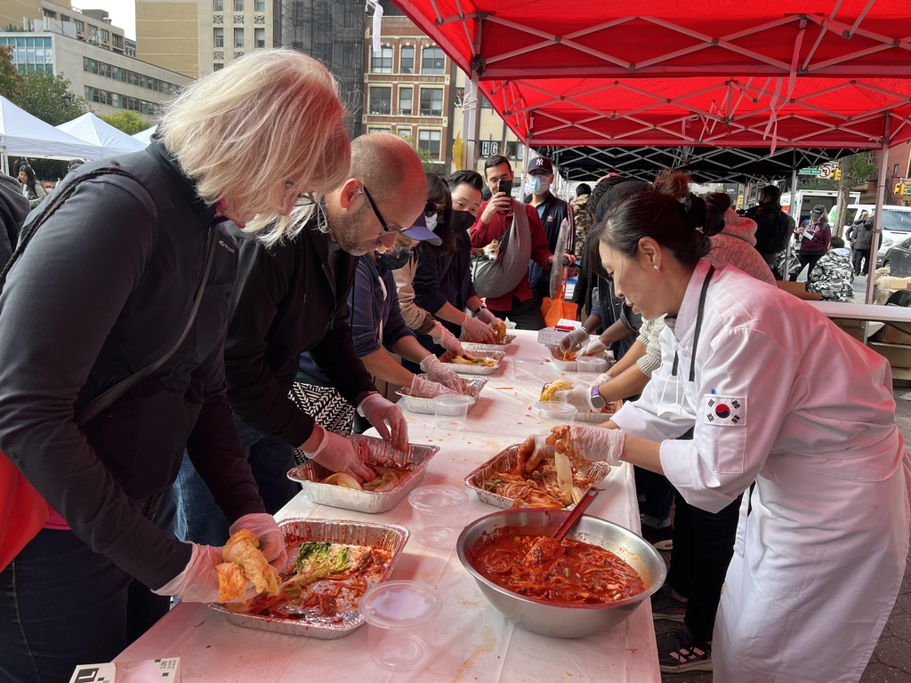 | ▲ 김장 체험하는 뉴요커들 (뉴욕=연합뉴스) 24일(현지시간) 미국 뉴욕 유니언스퀘어에서 열린 '2021 코리안 페스티벌'에서 김장 체험해보는 현지인 참가자들. 2021.10.25 [aT 미주지역본부 제공. 재판매 및 DB 금지] |